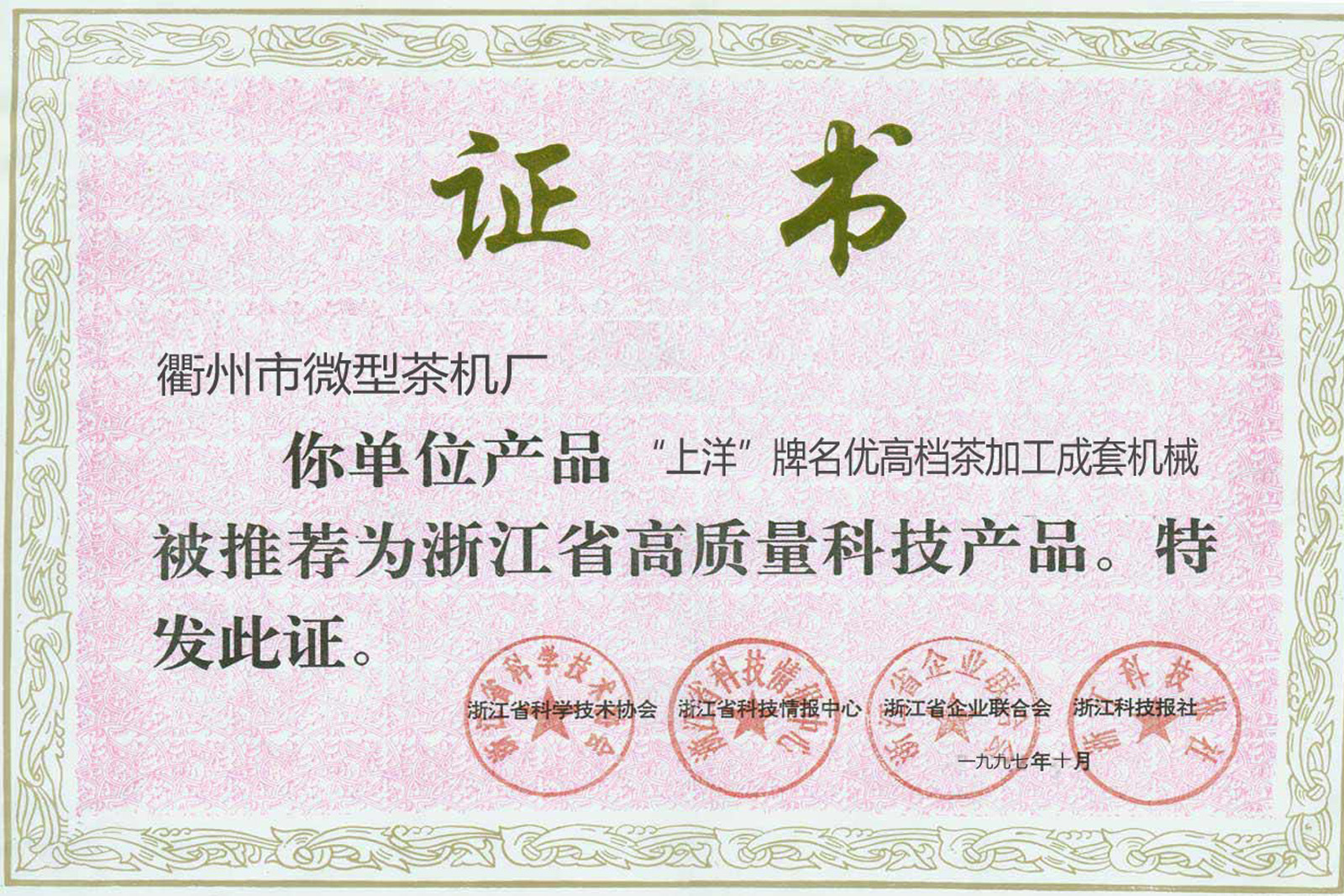 1997年10月,“上洋”牌名優高檔茶加工成套機械被評為浙江省高質量科技產品。