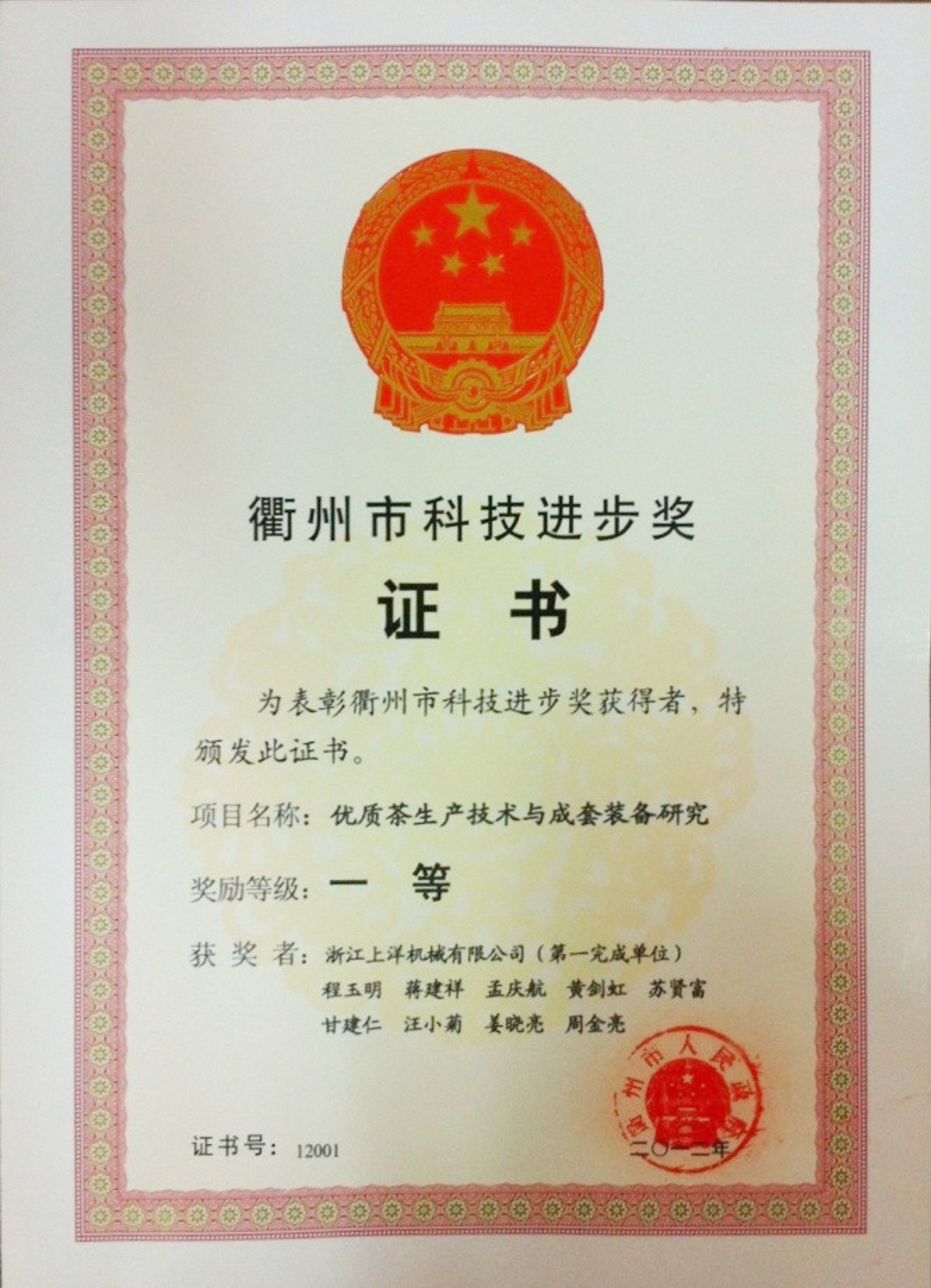 2012年衢州市科技進步一等獎