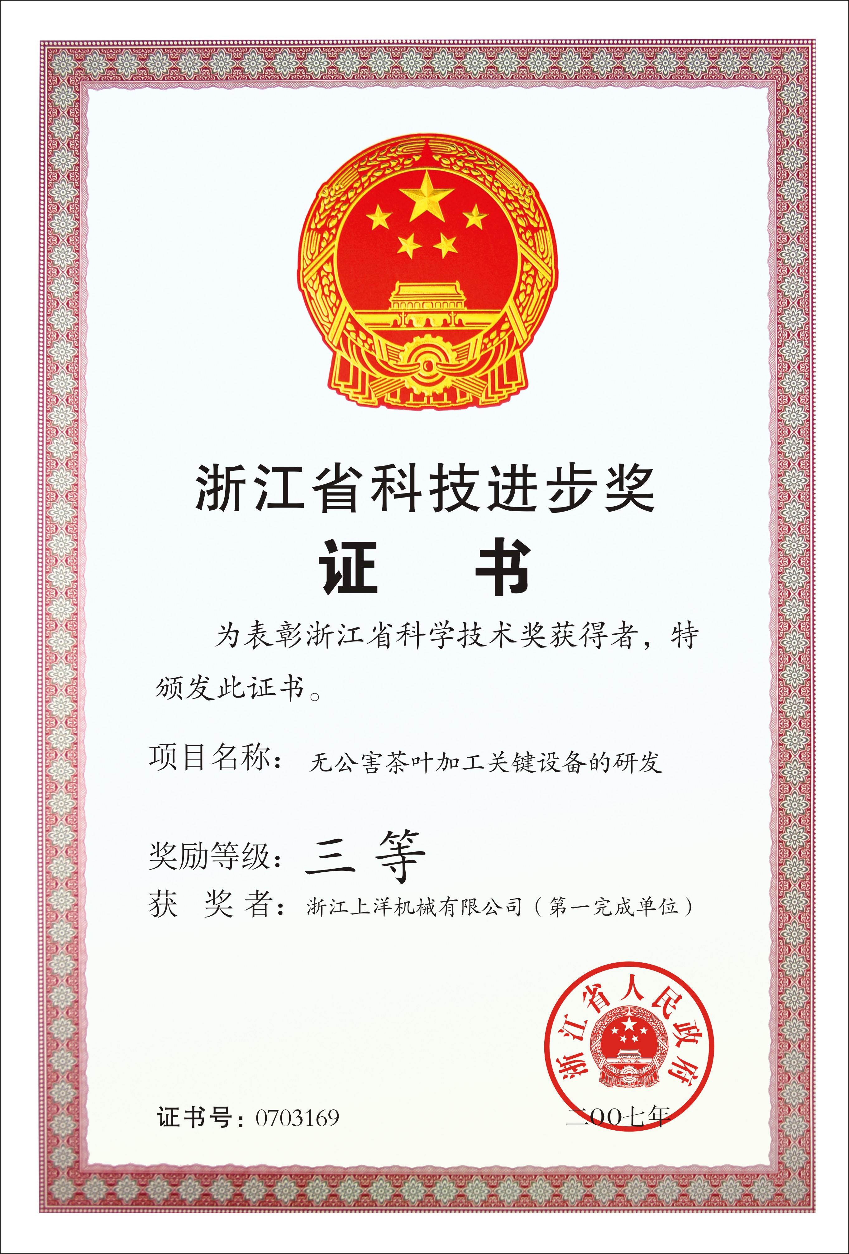2007年浙江省科技進步三等獎