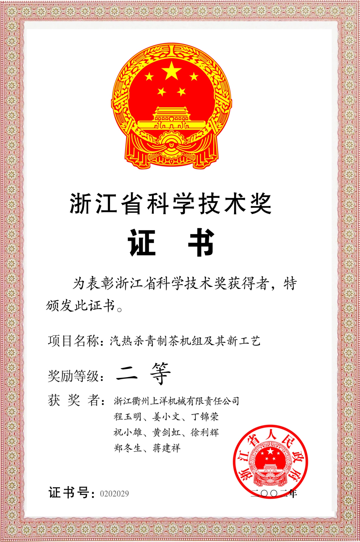 2002年浙江省科學(xué)技術(shù)獎二等獎