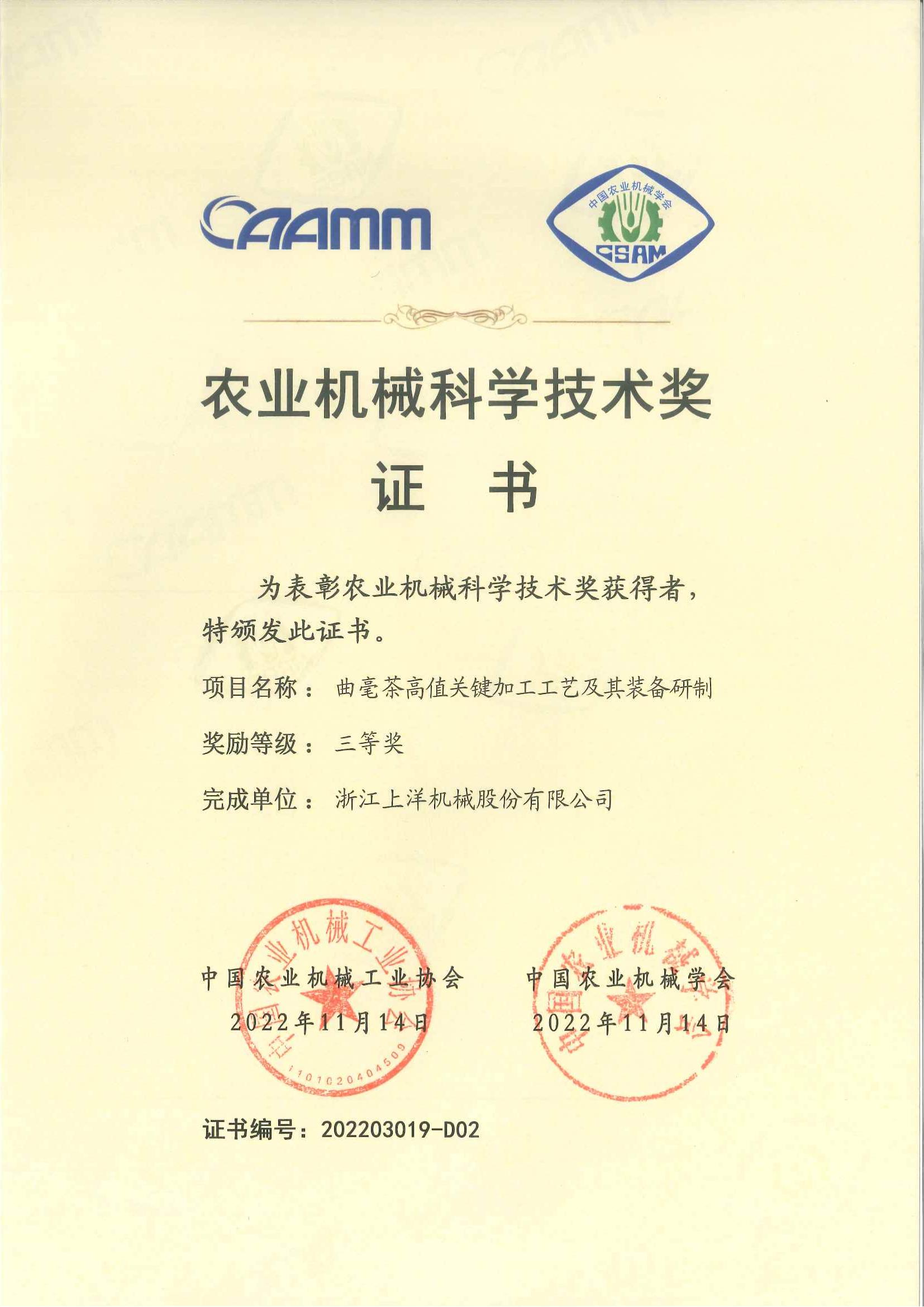2023年農(nóng)業(yè)機械科技技術(shù)三等獎