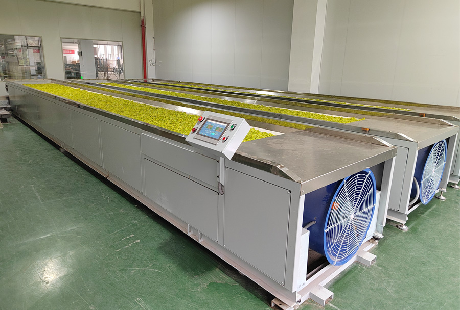 作業(yè)原理:單層式結(jié)構(gòu),機(jī)組采用的集中控制系統(tǒng)可精準(zhǔn)控制鼓風(fēng)時(shí)間、風(fēng)量、溫度、攤?cè)~厚度/重量等主要參數(shù),實(shí)現(xiàn)攤青(萎凋)的均勻充分。 利用光電定位系統(tǒng),能有效檢測茶葉流量,可自動控制茶葉進(jìn)入下一步工藝流程。